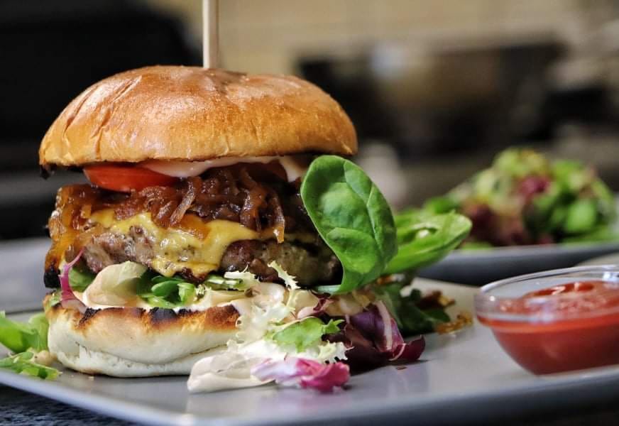 S karamelizovanou cibulkou + hranolky + dip (hovězí maso, cheddar, salát mix, karamelizovaná cibulka, dresink) – 239,-